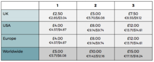 At Kite, we charge a per-item shipping rate, which we’ve simplified into four regional tiers. These are: UK, USA, Europe, and Worldwide (Rest of World).